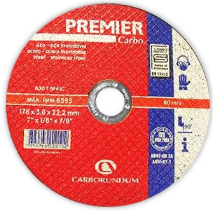 Características: La línea de discos PREMIER son versátiles y logran excelentes resultados trabajando con los más diversos tipos de aceros, incluso los aceros inoxidables y en materiales no ferrosos. Reduce de forma extraordinaria el tiempo de trabajo y en consecuencia reduce en gran medida los costos de operación. Su composición abrasiva es de Oxido de Aluminio y pueden ser usado tanto en maquinas del tipo angular y del tipo "Cut-off".