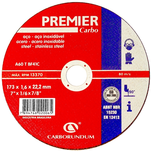 Características: La línea de discos PREMIER son versátiles y logran excelentes resultados trabajando con los más diversos tipos de aceros, incluso los aceros inoxidables y en materiales no ferrosos. Reduce de forma extraordinaria el tiempo de trabajo y en consecuencia reduce en gran medida los costos de operación. Su composición abrasiva es de Oxido de Aluminio y pueden ser usado tanto en maquinas del tipo angular y del tipo "Cut-off" .