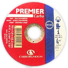 Características: La línea de discos PREMIER son versátiles y logran excelentes resultados trabajando con los más diversos tipos de aceros, incluso los aceros inoxidables y en materiales no ferrosos. Reduce de forma extraordinaria el tiempo de trabajo y en consecuencia reduce en gran medida los costos de operación. Su composición abrasiva es de Oxido de Aluminio y pueden ser usado tanto en maquinas del tipo angular y del tipo "Cut-off".