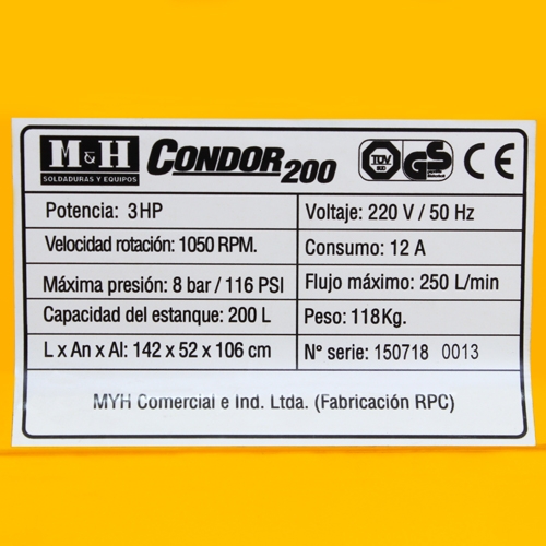 Compresor de uso industrial. Con válvula de seguridad contra exceso de presión y sistema de protección térmica por sobre consumo. Incluye una salida de aire regulable y una salida de aire directa con conectores de acople rápido. Recomendado para trabajo con herramientas neumáticas.